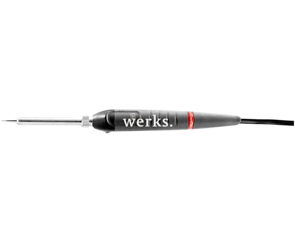 Эргономичный паяльник мощностью 25 Вт с двойной изоляцией. Обладает быстрым нагревом, поддерживает стабильную температуру и отличается высокой энергоэффективностью. Двухжильный ПВХ-кабель длиной 1,5 м. Хромированный корпус. Идеально подходит для ремонта электрических и электронных устройств. В комплекте идет стандартный острый наконечник 1230.15-35-P3 из хромникелевой стали и черный держатель. Длина - 240 мм. Стандартная вилка - тип В. Напряжение питания/мощность - AC 220-230V / 25 W. Вес - 130 г.