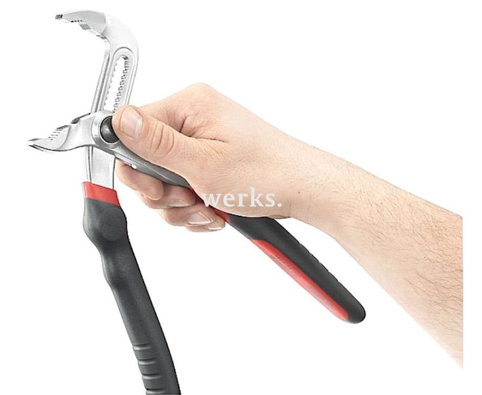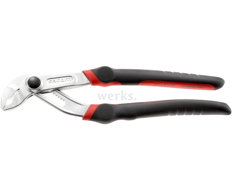 Переставные сантехнические клещи Facom длиной 245 мм, с диапазоном зажима трубы от 6 до 41 мм и 12-позиционной регулировкой. Оснащены фиксирующим двойным скользящим шарниром и узкими самозахватывающими губками. Изготовлены из высокопрочной хромванадиевой стали методом штамповки и имеют хромированное покрытие. Губки закалены высокочастотным методом, достигая твердости HRC 62. Двухкомпонентные рукоятки с противоскользящими чехлами обеспечивают удобство в работе. Закрытое положение ручек способствует увеличению силы затяжки. Эти клещи идеально подходят для работы с различными резьбовыми и трубными соединениями.