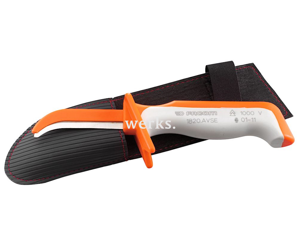 Изолированный нож длиной 185 мм с прочным лезвием из качественной стали длиной 60 мм, имеющим изогнутый конец. Соответствует стандартам VSE, безопасен для работы с узлами и материалами под напряжением до 1 000 В переменного тока. Эргономичная мягкая двухкомпонентная рукоятка. Универсальный инструмент для резки и снятия изоляции с кабелей. Поставляется с чехлом-ножнами.