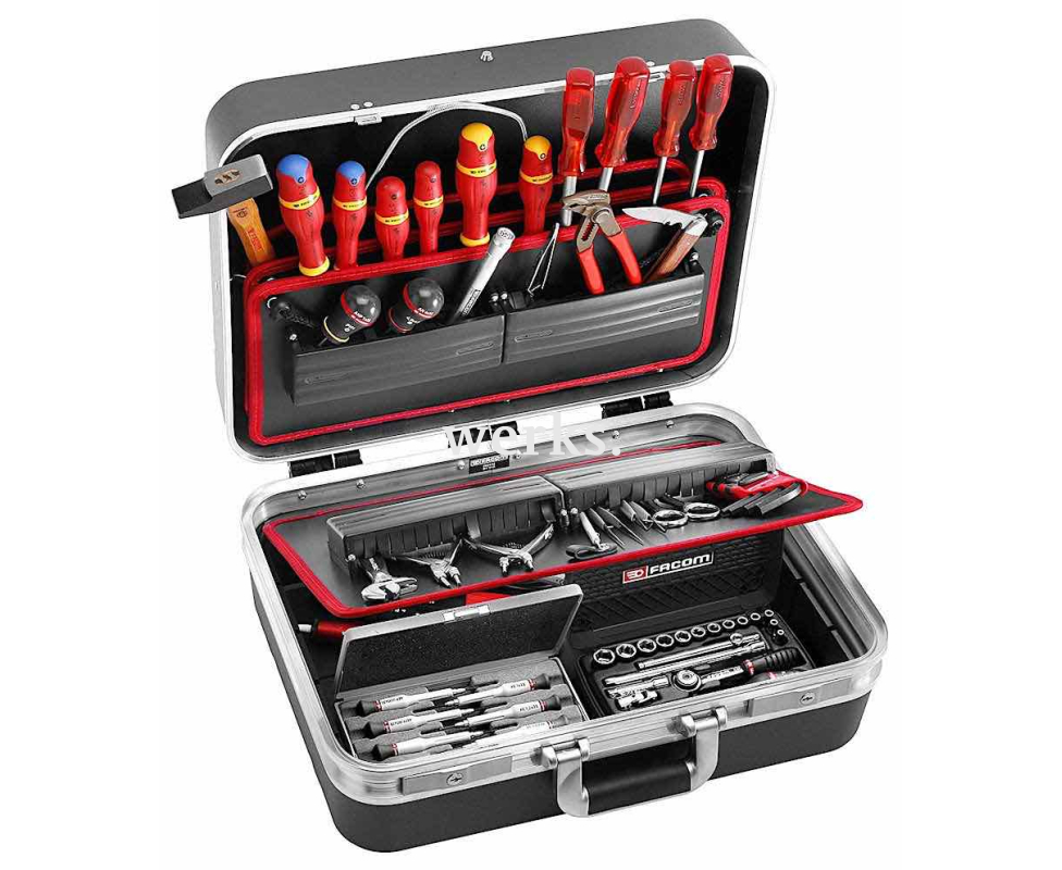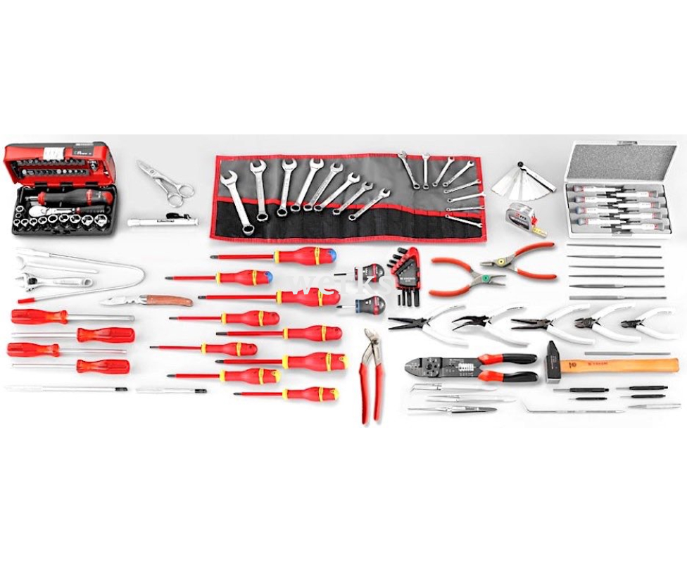 Профессиональный комплект из 122 инструментов, предназначенный для электротехнических и ремонтных работ. В него входят рожковые ключи, Г-образные ключи, разводной ключ, торцевые головки, диэлектрические шлицевые и крестовые отвертки, карбюраторные и прецизионные отвертки, сантехнические клещи, инструмент для снятия изоляции, прецизионные бокорезы, плоскогубцы и длинногубцы, съемники стопорных колец, паяльник, пинцеты, нож, ножницы, надфили, молоток, рулетка и пробойники. Комплект поставляется в прочном чемодане BV.51A размером 470x345x190 мм с съемными панелями.