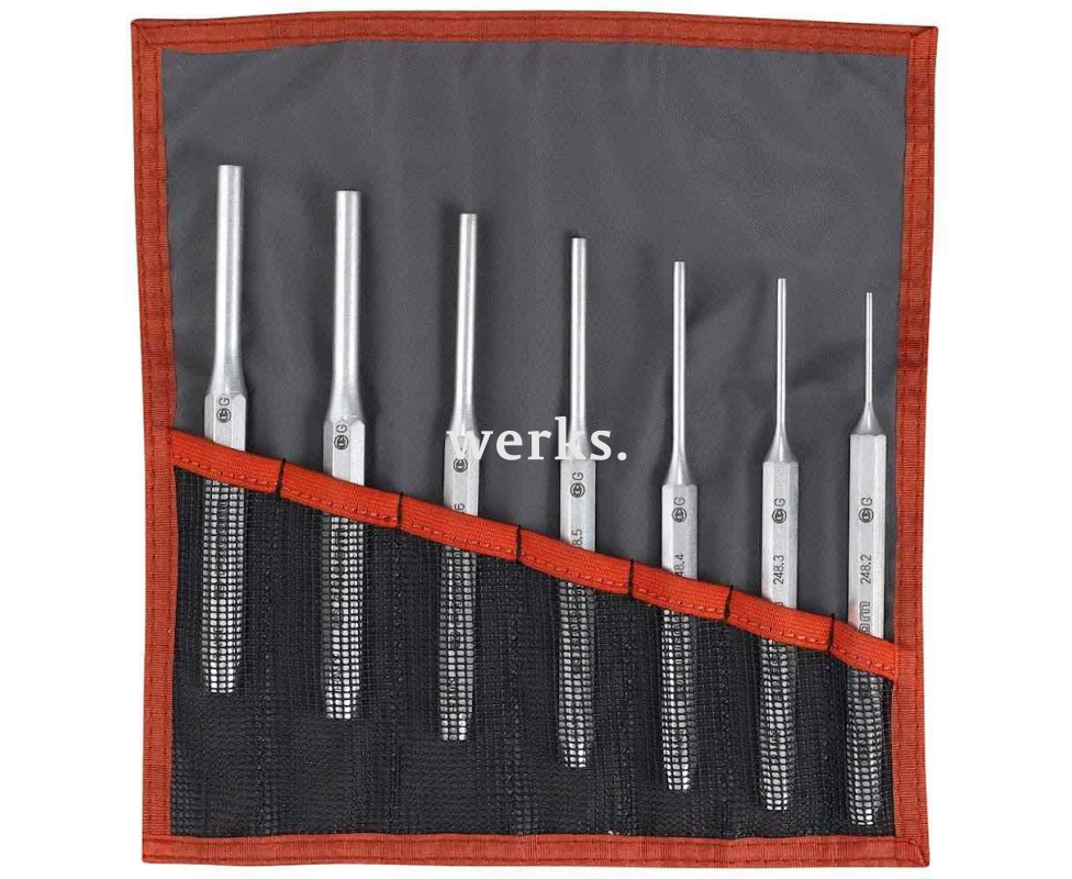 В комплект входят 7 выколоток, изготовленных из высококачественной легированной стали. Они предназначены для извлечения крепежных элементов из отверстий различного диаметра в металлических поверхностях. Упакованы в надежный нейлоновый держатель размером 265х120 мм.