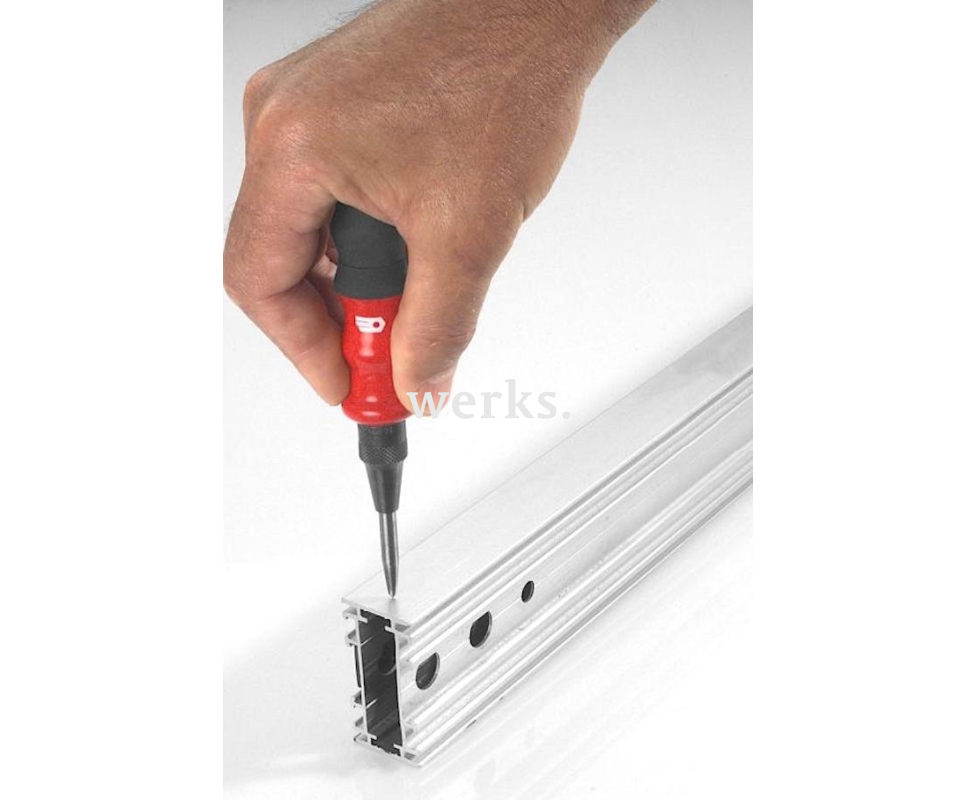 Автоматический кернер Facom длиной 140 мм и весом 175 г. Изготовлен из кованой хромванадиевой стали, рабочая часть имеет твердость HRC 55-58. Оснащен эргономичной амортизирующей рукояткой. Удар активируется пружиной при простом нажатии на головку, а сила удара регулируется в диапазоне 15-25 кг с помощью завинчивающейся головки. Предназначен для точной маркировки или пробивки металла перед сверлением. Это высококачественный инструмент, который обеспечит долгий срок службы.