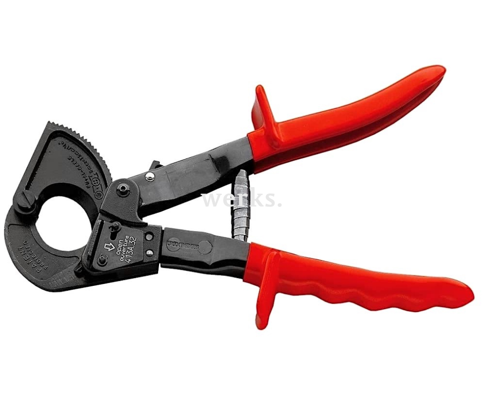 Кабелерез Facom длиной 255 мм и весом 385 г оснащен трещоткой, что позволяет легко резать медные и алюминиевые кабели и провода диаметром до 32 мм без их повреждения. Изготовлен из высококачественной черненой стали. Храповый механизм обеспечивает резку толстых кабелей с минимальными усилиями. Инструмент имеет сменные ножи и раскрывающую пружину. Рукоятки покрыты нескользящими ПВХ-чехлами и защищены кожухами. Это профессиональный инструмент, идеально подходящий для работы в ограниченных пространствах.