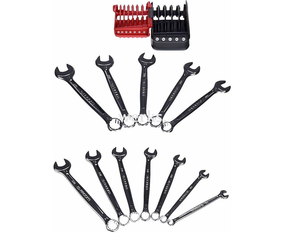 Ключи изготовлены из прочной хромванадиевой стали и имеют полное хромирование. Размерный диапазон составляет 7-24 мм. Накидной кольцевой ключ оснащен 12-точечной зоной захвата OGV и углом наклона головки 15°. Метрические ключи обладают высокими механическими свойствами, соответствующими авиационным стандартам. Форма рукоятки оптимизирована для удобства использования. Набор поставляется в практичном держателе с индивидуальным местом для каждого ключа и надежной фиксацией.