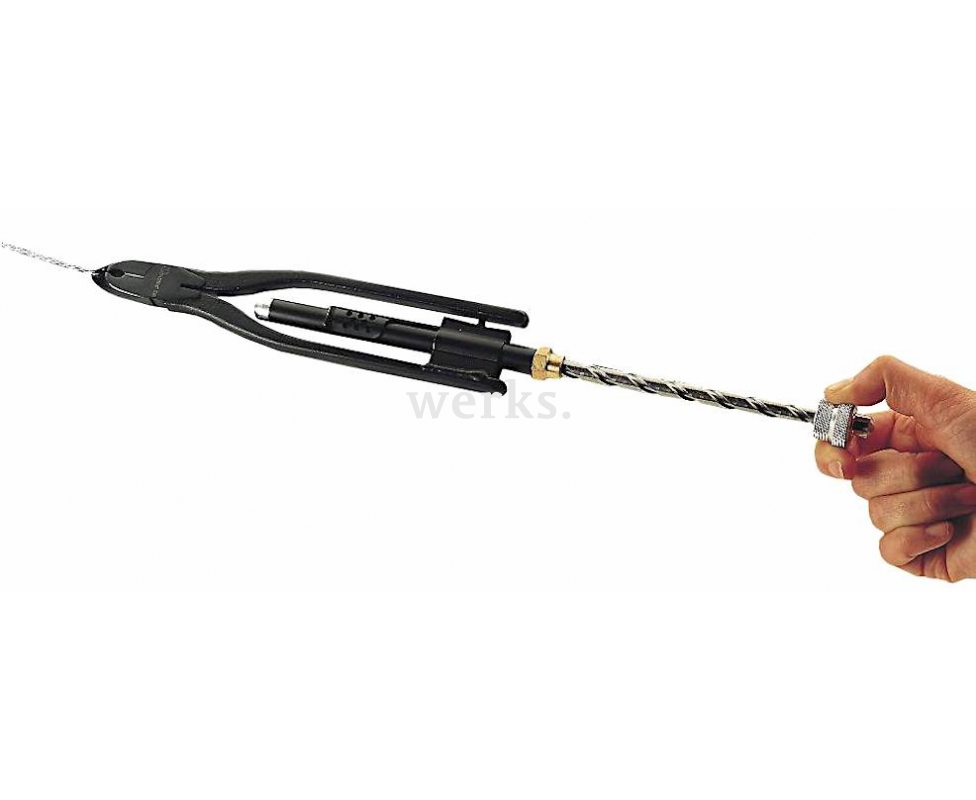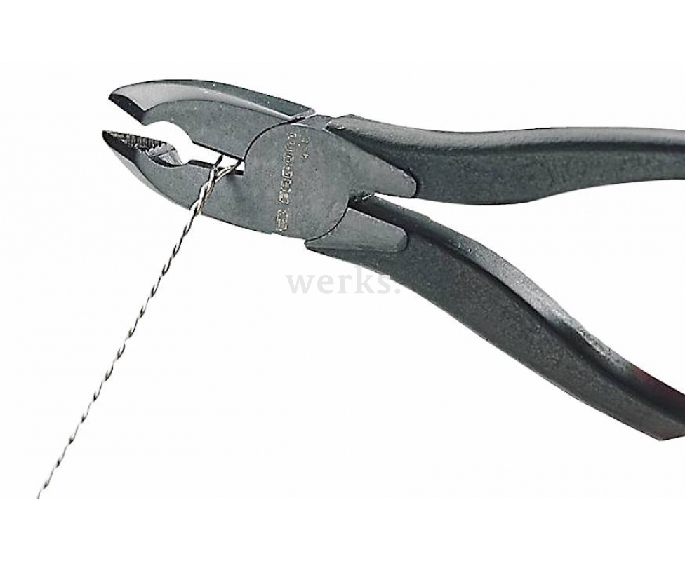 Профессиональные контровочные плоскогубцы длиной 215 мм с головкой шириной 15 мм, изготовленные из легированной хром-ванадий-молибденовой стали и обладающие хромированным покрытием. Режущие кромки дополнительно подвергнуты индукционной закалке, что позволяет им резать нержавеющую сталь диаметром 1 мм. Шток имеет 2.5 оборота и ход 95 мм. Усовершенствованный тонкий носик составляет 3 мм. Эти плоскогубцы предназначены для законтривания тормозных тросов безопасности при их скручивании, что обеспечивает надежную блокировку узлов, подверженных значительным вибрациям.