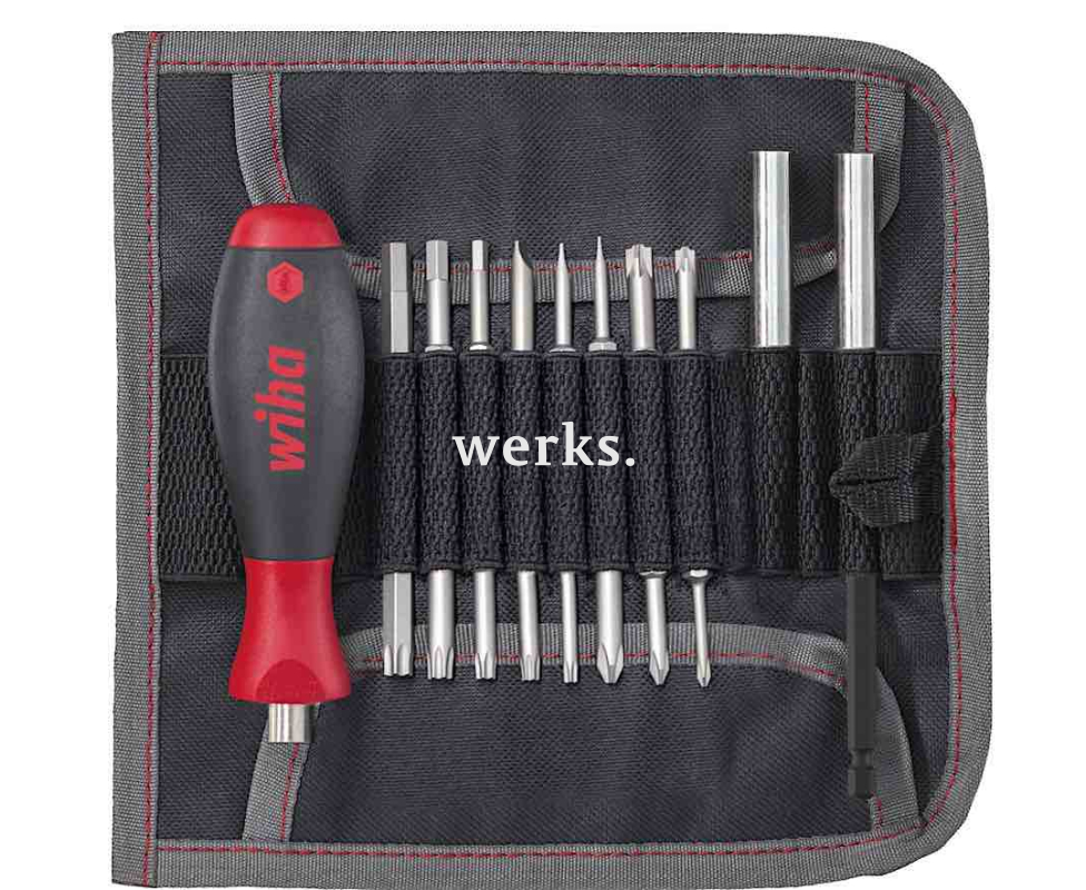Комплект из 50-мм двусторонних бит (SL PH HEX TORX SL/PZ) с эргономичной рукояткой SoftFinish и двумя магнитными держателями для бит, предназначенный для монтажных и ремонтных задач. Включает специальные длинные биты, которые позволяют выкручивать винты в труднодоступных местах. Удобная портативная сумка-скатка из нейлона. В наборе 20 элементов. Подходит для использования как вручную, так и с помощью электроинструментов.