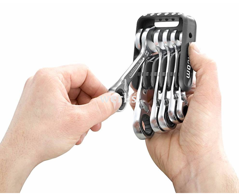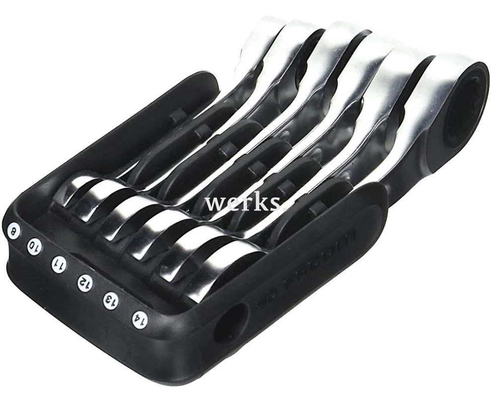 Комплект из 6 профессиональных комбинированных гаечных ключей с шарниром Facom, размеры которых варьируются от 8 до 14 мм. Набор поставляется в прочном карманном органайзере, где для каждого ключа предусмотрено отдельное место с надежной фиксацией. Накидная 12-гранная часть ключа оснащена храповым механизмом с углом возврата 5°, что обеспечивает высокую гибкость и удобство при работе с винтами и гайками без необходимости переставлять инструмент. Реверс осуществляется с помощью флажкового переключателя, а рожковая часть ключа имеет наклон в 15°.