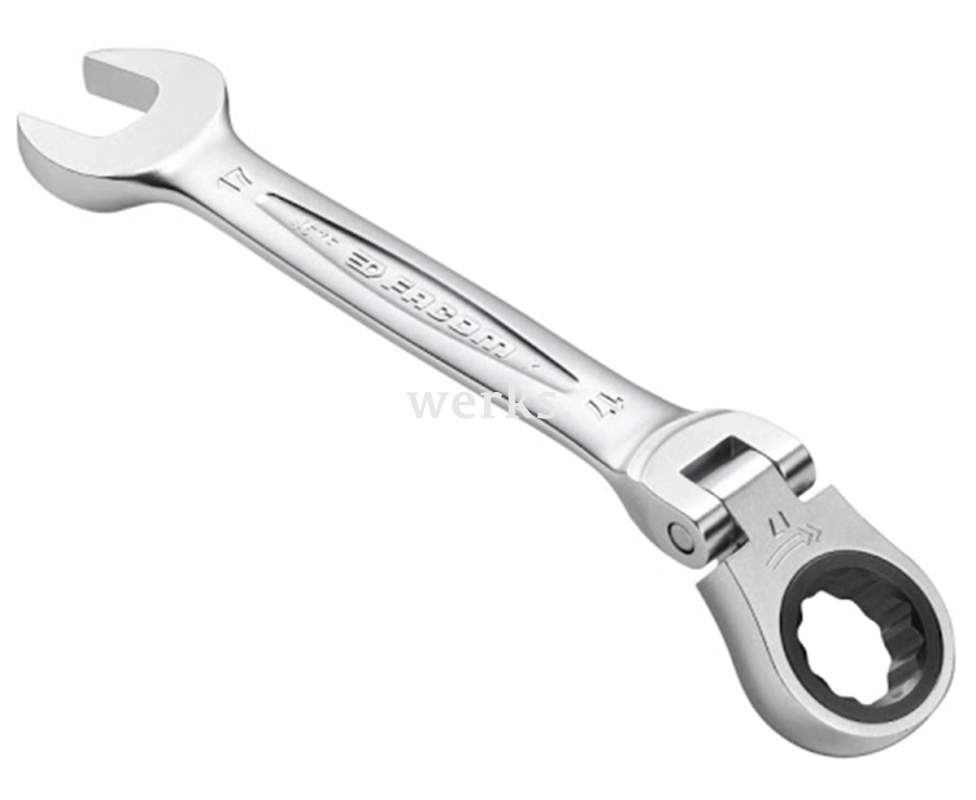 Набор из 10 профессиональных комбинированных гаечных ключей с шарниром Facom 467F.JP10 включает размеры от 8 до 19 мм. Он поставляется в практичном кейсе, где для каждого ключа предусмотрено отдельное место с надежной фиксацией. Накидная часть ключа оснащена храповым механизмом, поворотным на 180° шарниром и углом захвата 5°, что обеспечивает высокую гибкость и удобство при работе с винтами и гайками без необходимости переставлять ключ. Реверс осуществляется простым переворотом ключа. Рожковая часть ключа имеет наклон 15°. Снят с производства.