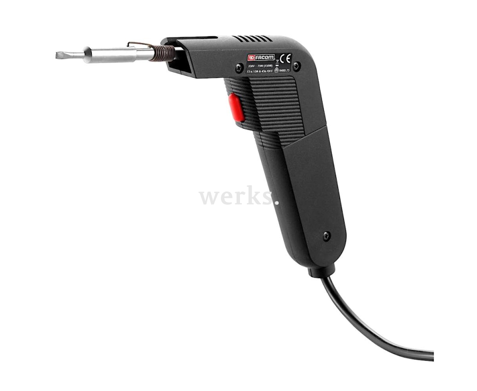 Многофункциональный паяльник с мощностью 75 Вт. Обладает быстрым временем нагрева (15 секунд) и поддерживает стабильную температуру при нажатой кнопке; после отпускания кнопки жало быстро остывает. Длина ПВХ-кабеля составляет 150 см. Хромированный корпус. Удобная ручка в форме пистолета. Отлично подходит для ремонта электронных устройств. Поставляется с обычным трапециевидным наконечником 848.75P1. Длина - 198 мм. Напряжение питания/мощность - AC 220-240V / 75 W. Вес - 100 г.
