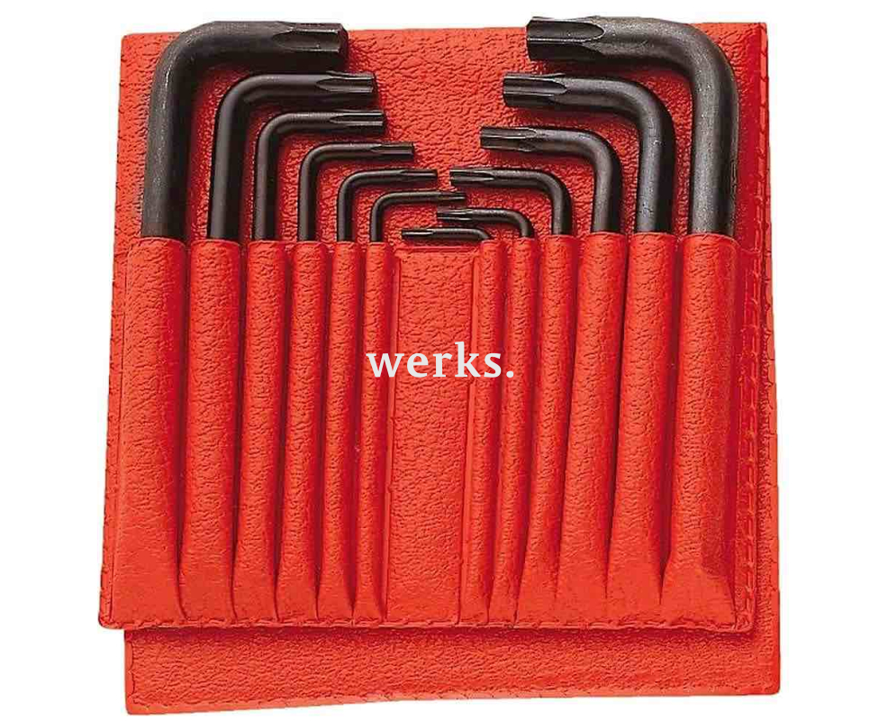 Набор из 8 штифтовых ключей Facom для винтов с внутренним TORX размером Т8-Т40 мм, упакованный в компактный чехол-скатку. Изготовлены из углеродной кремнистой стали, обработаны фосфатированием, что обеспечивает надежную защиту от коррозии.