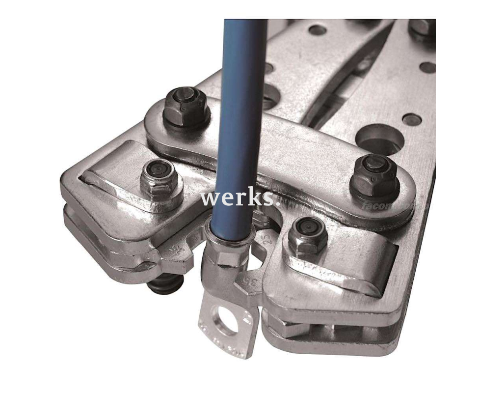 Усиленные обжимные клещи, изготовленные из закаленной термообработанной стали, позволяют отсоединять клещи во время процесса опрессовки. Они предназначены для обжима трубчатых наконечников. Поворотная плашка из углеродистой стали имеет 6 гнезд для обжима: 6-10-16-25-35-50 мм². Удлиненные рукоятки обеспечивают удобный захват двумя руками.