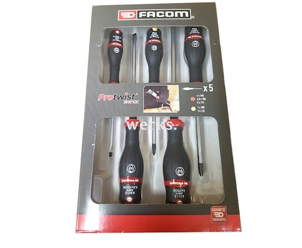 В комплект входят 3 ударные отвертки Facom Protwist с прямым шлицем и 2 ударные крестовые отвертки Phillips, изготовленные из высококачественной углеродистой кремнистой стали. Они оснащены шестигранным жалом, обладающим повышенной прочностью на изгиб и разрыв, а также черненым рабочим наконечником. В основании жала имеется вспомогательный шестигранник для использования с гаечным ключом. Стержень завершается колпачком на верхней части рукоятки, что позволяет применять молоток. Матовое хромирование жала обеспечивает дополнительную защиту от коррозии. Двухкомпонентные эргономичные рукоятки Soft Grip обеспечивают улучшенную передачу крутящего момента и обладают высокой устойчивостью к ударам, износу и химическим воздействиям. Рукоятки имеют цветовую маркировку. Упаковано в картонную коробку.