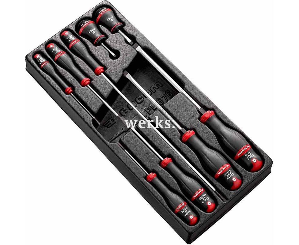 Отвертки находятся в термоформованном модуле PL 676. Жала изготовлены из высококачественной стали, с хромированным покрытием и черненым рабочим концом. Эргономичные рукоятки из двух компонентов обеспечивают оптимальную передачу крутящего момента на винт. Они незаменимы в автомастерских и на производственных площадках для работы с винтами с прямым шлицем. В универсальном наборе представлены отвертки от карбюраторной до усиленной с шестигранным жалом.