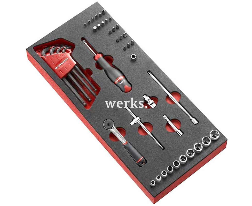 Профессиональный набор инструментов с приводом 1/4' включает в себя: - 10 торцевых головок с шестигранным профилем размером от 5.5 до 14 мм, - 20 бит 1/4' (SL, PH, PZ, HEX, TORX, TR), - 8 ключей с шестигранной головкой и сферическим концом (1.5-10 мм), - трещотку 1/4', - удлинители 1/4' длиной 55 и 150 мм, - держатель бит 1/4', - отвертку-битодержатель, - карданный шарнир, - вороток с бегунком 1/4'. Набор поставляется в модульном органайзере из пенопласта PM.MODR1AN, который совместим с инструментальными тележками Facom и чемоданом MBOX.L.