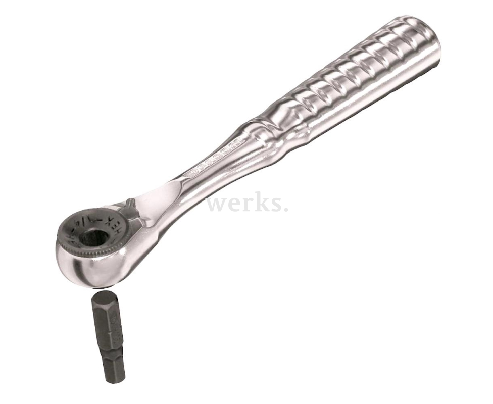 Изготовлен из прочной хромванадиевой стали с хромированным покрытием. Компактная головка с защитой от пыли. Оснащен флажковым переключателем реверса. Обеспечивает быструю и простую замену насадок. Храповый механизм с 60 зубьями, угол возврата составляет 6°. Стальная рукоятка с рифлением. Совместим с насадками с шестигранным хвостовиком 1/4'. Удобный в обслуживании, надежный и практичный инструмент для автосервисов и монтажных работ.