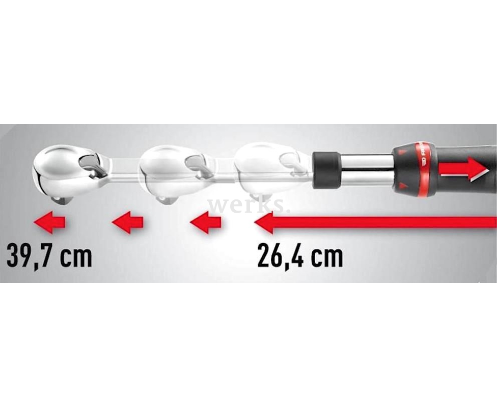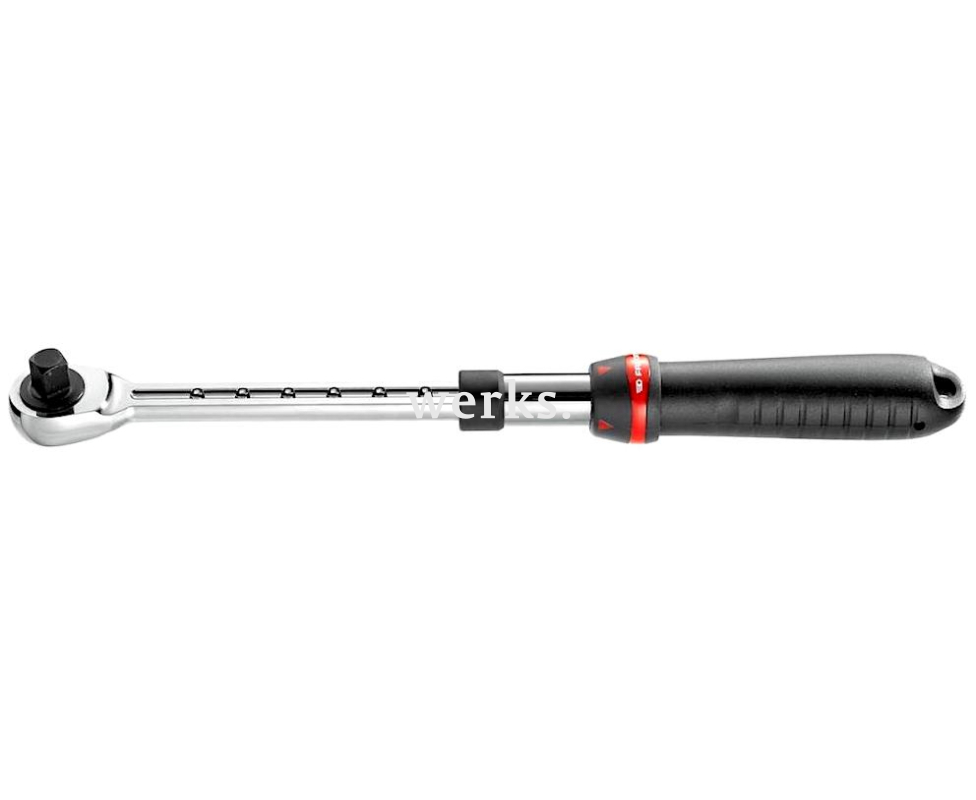Изготовлен из прочной хромванадиевой стали с хромированным покрытием. Компактная головка защищена от пыли. Переключение направления вращения осуществляется с помощью флажкового переключателя. Длина инструмента регулируется в пределах 264-397 мм с помощью кнопки, предлагая 8 фиксированных позиций. Храповый механизм имеет 72 зубца, угол возврата составляет 5°. Рукоятка оснащена двухкомпонентным нескользящим покрытием из эластомера, устойчивого к износу и агрессивным химическим веществам. В ручке предусмотрено отверстие для подвешивания при хранении и для крепления страховочного тросика при работе на высоте. Этот инструмент прост в обслуживании, надежен и удобен для использования в авторемонтных мастерских и монтажных работах.