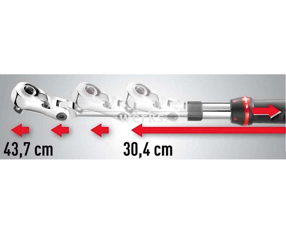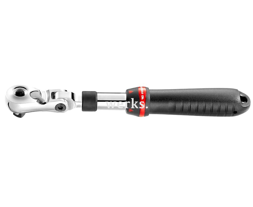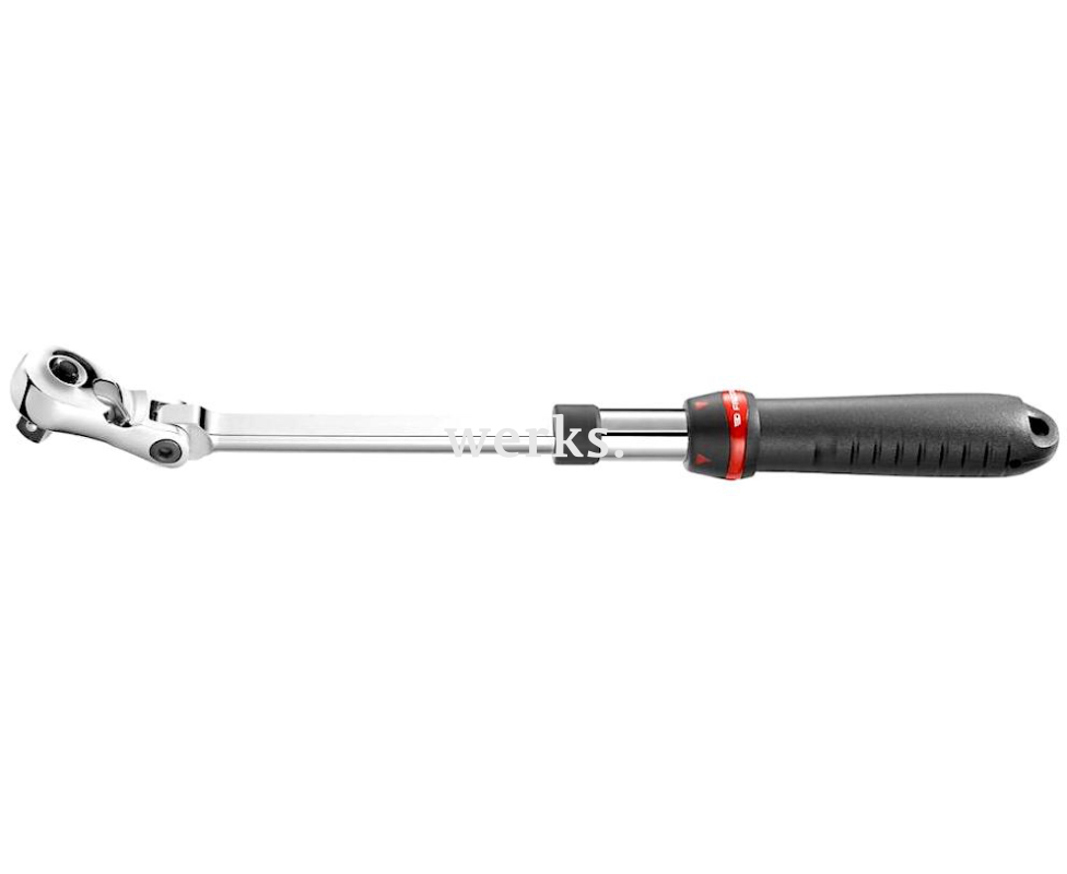 Изготовлен из прочной хромванадиевой стали с хромированным покрытием. Компактная шарнирная головка с возможностью поворота на 180° в пылезащищенном исполнении, не требует обслуживания. Переключение направления вращения осуществляется с помощью флажкового переключателя. Длина инструмента регулируется в диапазоне от 304 до 437 мм с помощью кнопки, предлагая 8 фиксированных положений. Храповый механизм имеет 72 зубца, угол возврата составляет 5°. Рукоятка оснащена двухкомпонентным нескользящим покрытием из эластомера, устойчивого к износу и агрессивным химическим веществам. В ручке предусмотрено отверстие для подвешивания при хранении и для крепления страховочного тросика при работе на высоте. Этот инструмент прост в обслуживании, надежен и удобен для использования в авторемонтных мастерских и монтажных работах.