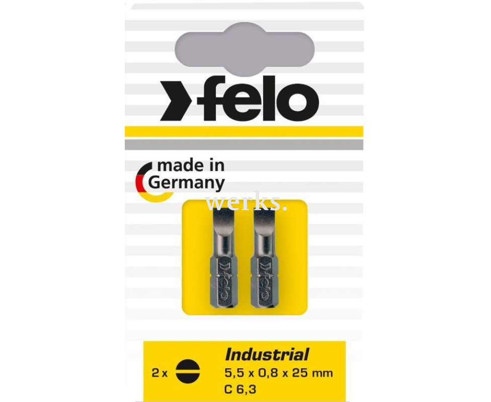 В комплект входят две шлицевые биты Felo Industrial размером 5.5х0.8 мм и длиной 25 мм. Упаковка выполнена в виде блистера на подложке. 020 510 36