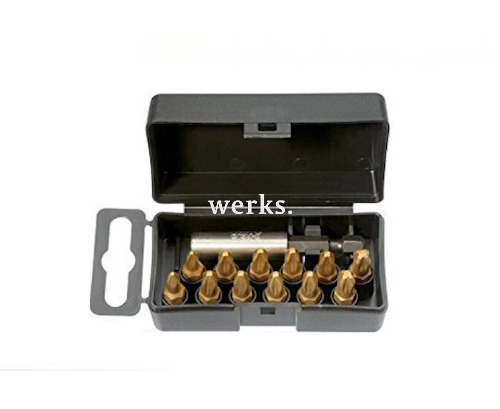 В комплект входят 12 крестовых бит Pozidriv Felo длиной 25 мм, а также магнитный битодержатель длиной 58 мм. Упаковано в пластиковый контейнер с ручкой, что делает его удобным для хранения и транспортировки.