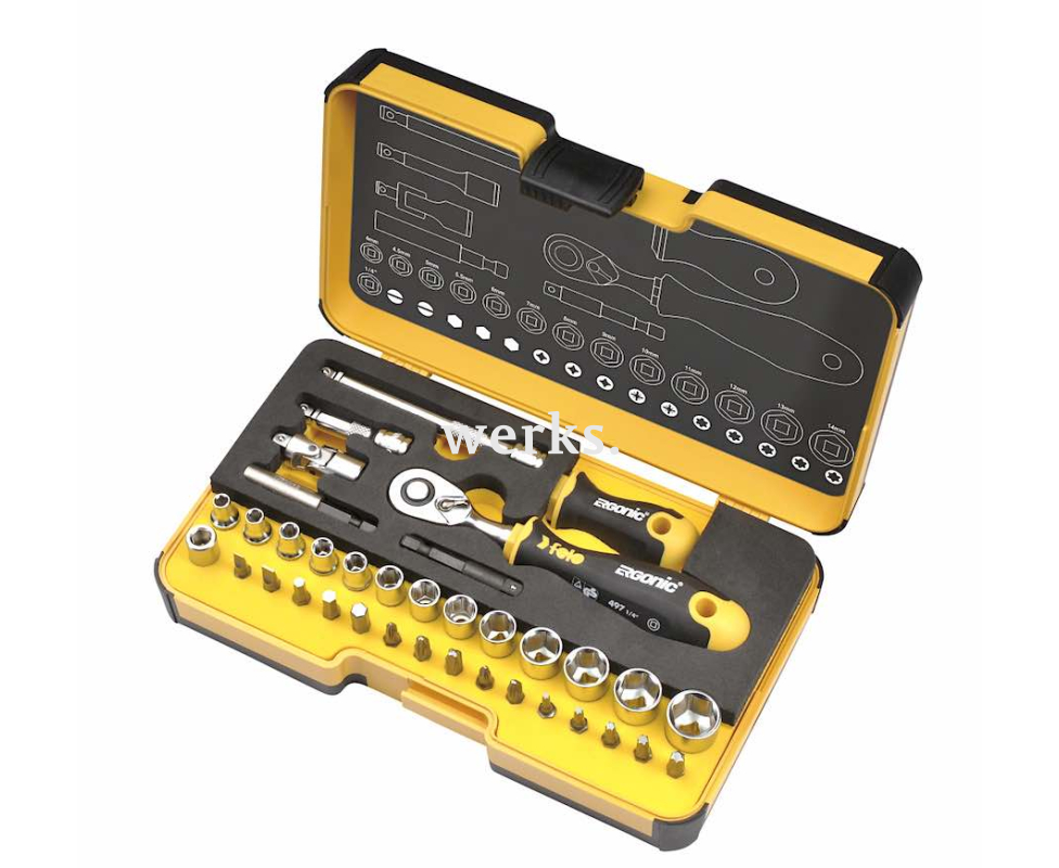 В комплекте бит Felo Industrial представлены шлицевые, крестовые Phillips, TORX, Robertson и НЕХ длиной 25 мм, а также 13 дюймовых торцевых головок HEX Nut Felo, удлинители на 50 и 100 мм, укороченная отвертка с рукояткой ERGONIC Stubby 1/4'', карданный переходник с квадрата 1/4' на шестигранник 1/4', адаптер и трещотка 1/4' с рукояткой ERGONIC, имеющая 72 зубца. Комплект поставляется в компактной пластиковой коробке размером 230х130х56 мм с ячейками для бит.