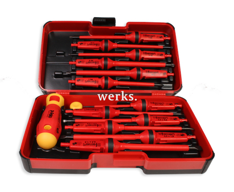 Комплект из 12 диэлектрических бит-отверток с самыми распространенными типами шлицов, VDE рукоятка-держатель и прецизионная насадка. Упакован в надежный и компактный кейс с молнией. Доступен в блистерной упаковке.