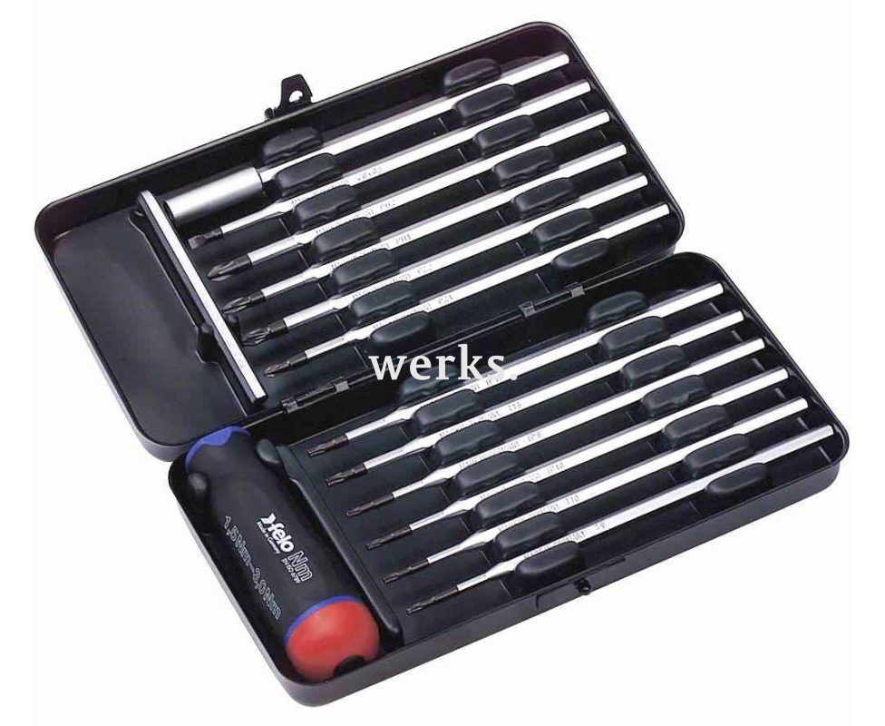 В комплект входит динамометрическая отвертка-держатель для бит с регулируемым моментом (1,5 ~ 3,0 Нм) и 12 насадками (170 мм), включая основные типы шлицев: прямой, крестовые шлицы Phillips и Pozidriv, а также звездообразные TORX и TORX TR с отверстием для защитного штырька. Упаковано в практичный и компактный металлический кейс.