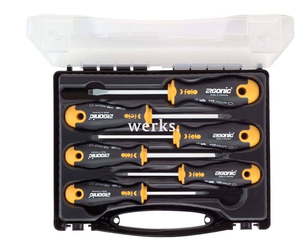 Отвертки SL PH PZ Felo Ergonic, предназначенные для профессионального использования, поставляются в практичном кейсе, который удобно хранить и транспортировать.