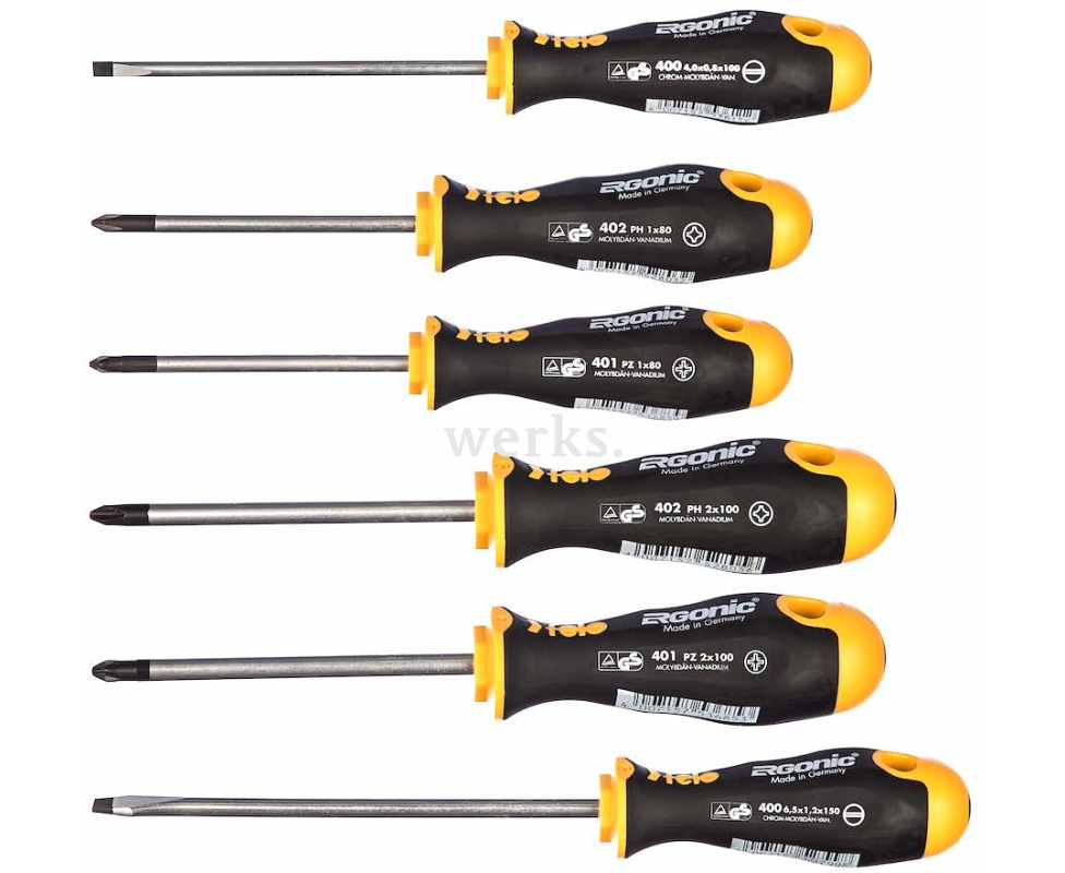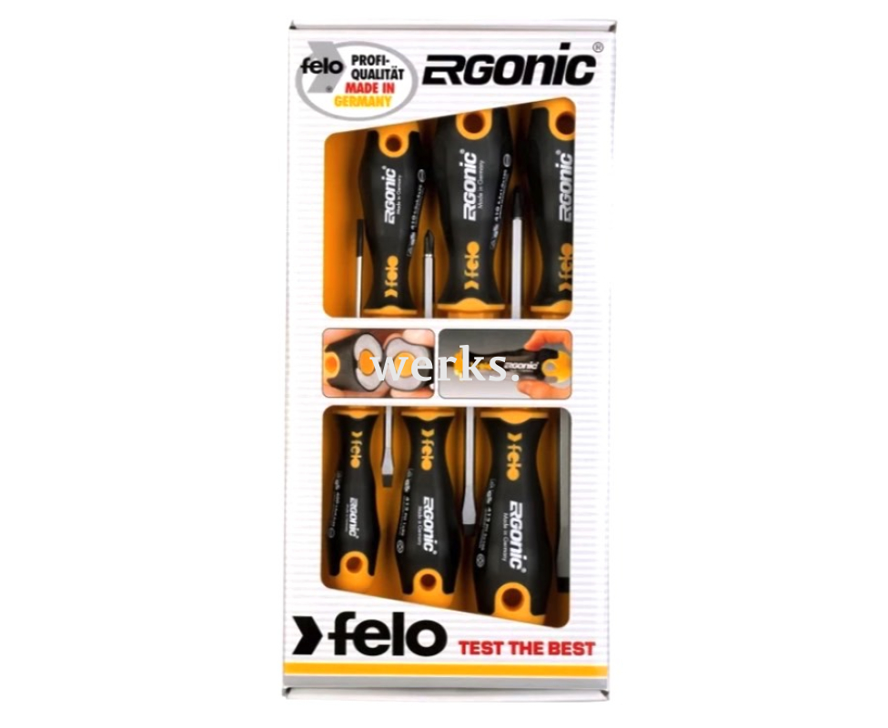 Комплект из шести высококачественных отверток Felo Ergonic SL PH PZ. Рукоятка Ergonic идеально соответствует форме руки пользователя.