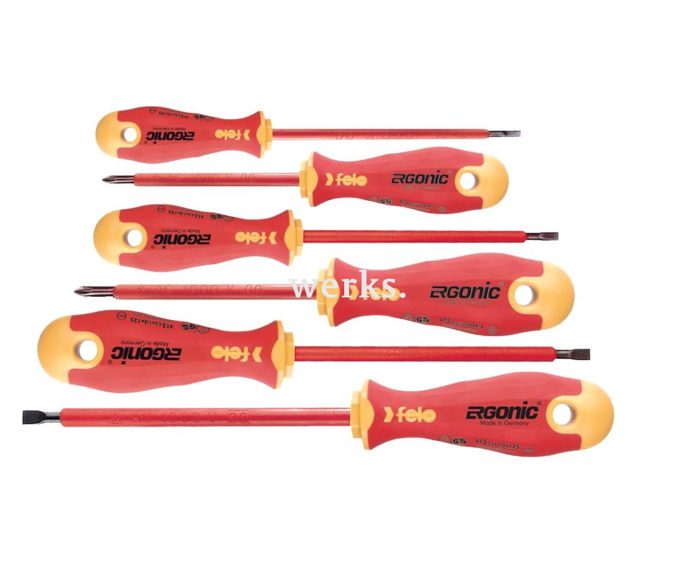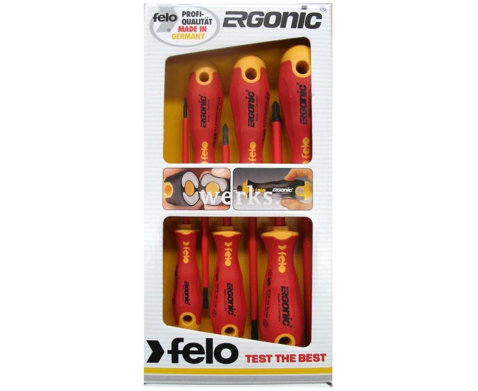 В комплект входят 4 отвертки Felo Ergonic с прямым лезвием и 2 крестовые отвертки Phillips, обладающие бесшовными, диэлектрическими рукоятками, предотвращающими скольжение. В верхней части рукоятки предусмотрены специальные отверстия для передачи дополнительного усилия на инструмент. Все отвертки соответствуют стандартам VDE и безопасны для использования с электрическим оборудованием под напряжением до 1000 В переменного тока.
