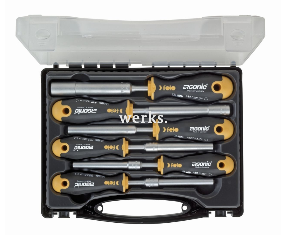 Набор из 6 торцевых отверток с профилем HEX Nut размером от 5,5 до 13 мм Felo Ergonic M-TEC 42810636. Ударопрочные стержни изготовлены из хром-молибден-ванадиевой стали и оснащены встроенной подвижной пружиной и мощным магнитом, что позволяет удобно работать с гайками на шпильках, утапливая их внутрь стержня. Пружины могут утапливаться на 2/3 длины стержня. Комфорт в работе и снижение усталости обеспечиваются благодаря эргономичным рукояткам Ergonic. Также предусмотрены отверстия для подвешивания или дотяжки рычагом. Набор отлично подходит для выполнения монтажных работ в труднодоступных местах.