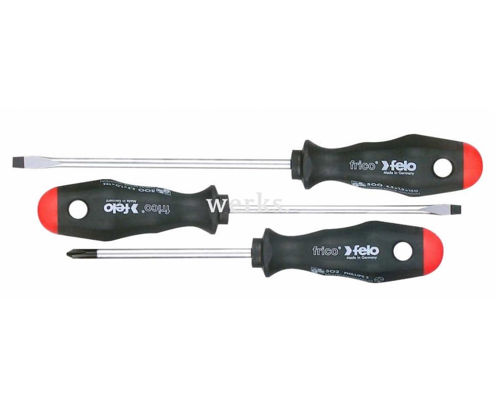 В комплект входят две отвертки Felo frico с плоским лезвием и одна крестовая отвертка типа Phillips. 500 934 14