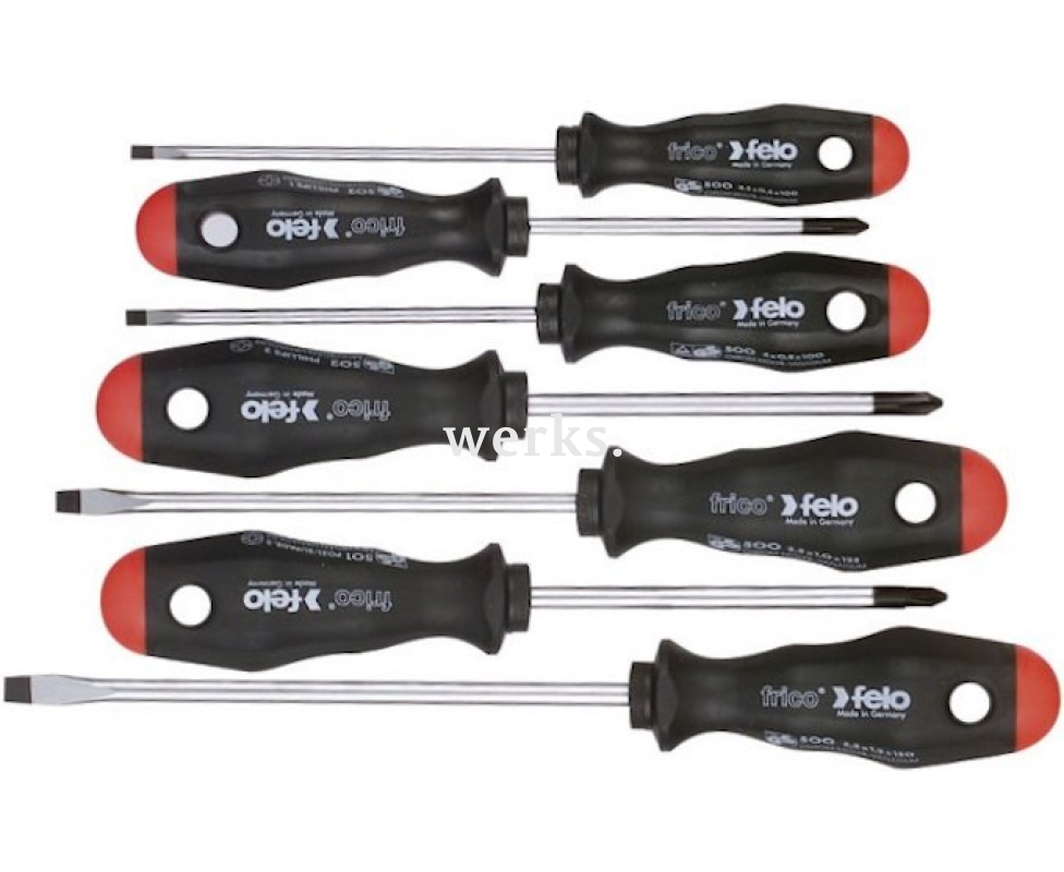 В комплект входят 3 отвертки Felo frico с плоским лезвием и 2 крестовые отвертки типа Phillips.