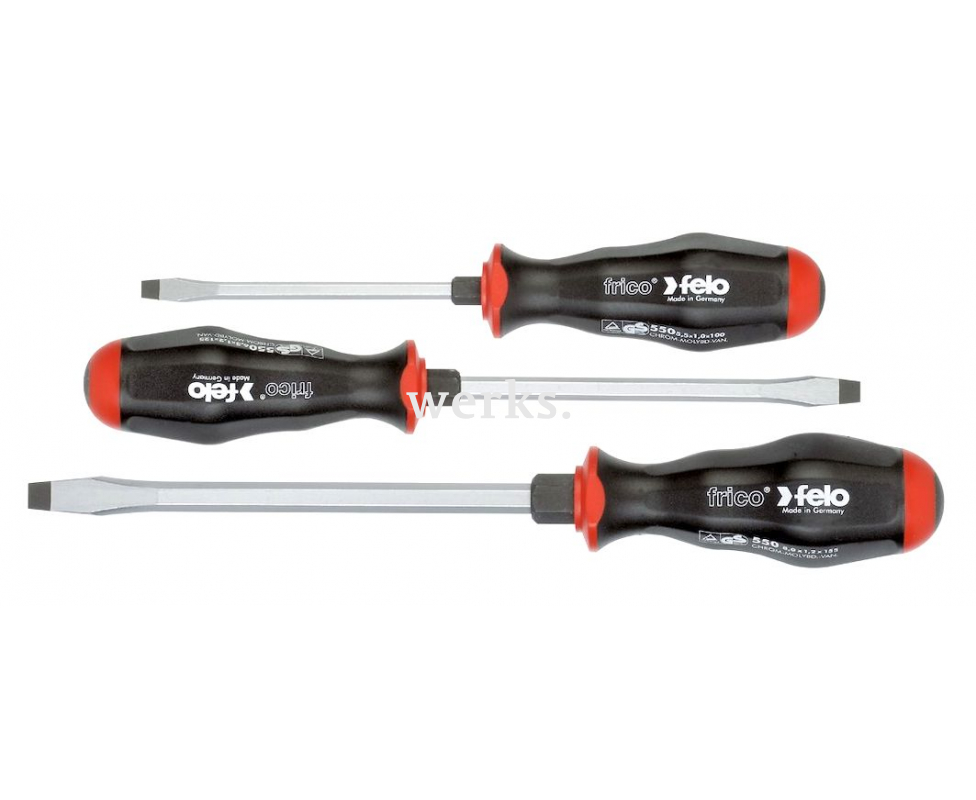 В комплект входят три шлицевые ударные отвертки Felo frico с шестигранным наконечником. Этот надежный и долговечный инструмент идеально подходит для работы с трудновынимаемыми винтами.