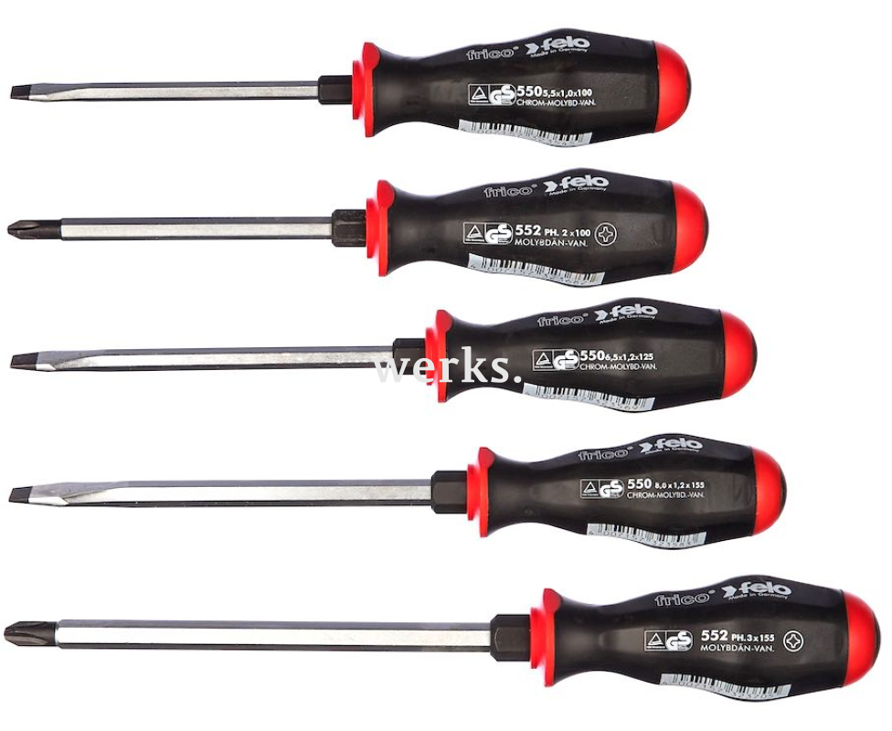 Комплект включает 3 шлицевые и 2 крестовые отвертки Phillips ударного типа от Felo frico с шестигранным наконечником. На ручках присутствует обозначение типа и размера шлица.