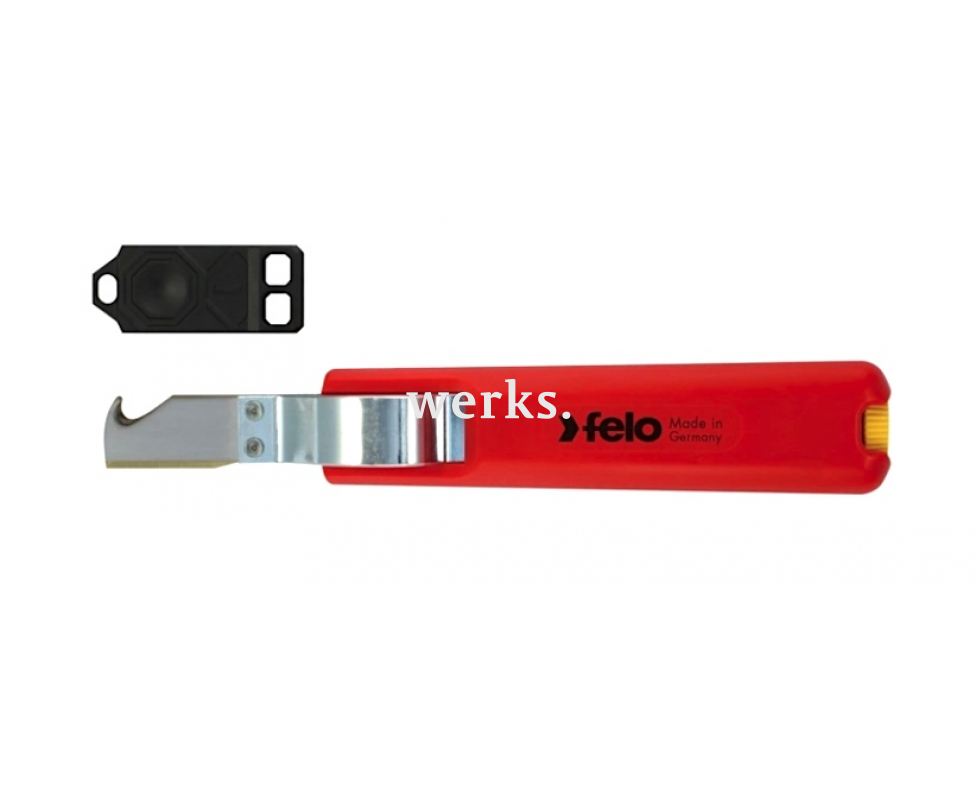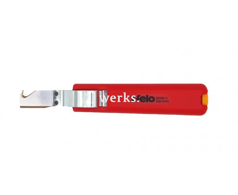 Инструмент длиной 180 мм предназначен для удаления изоляции с одно- или многожильных кабелей диаметром от 8 до 28 мм. Нож изготовлен из высокопрочной инструментальной стали, что позволяет выполнять круговые, продольные и спиральные резы. Лезвие имеет покрытие из нитрида титана и оснащено регулировкой диаметра и глубины реза. В рукоятке предусмотрен запасной нож. Конструкция лезвия предотвращает повреждение жил кабеля. Инструмент соответствует стандартам VDE и безопасен для работы с кабелями под напряжением до 1000 В переменного тока. Поставляется в блистерной упаковке.