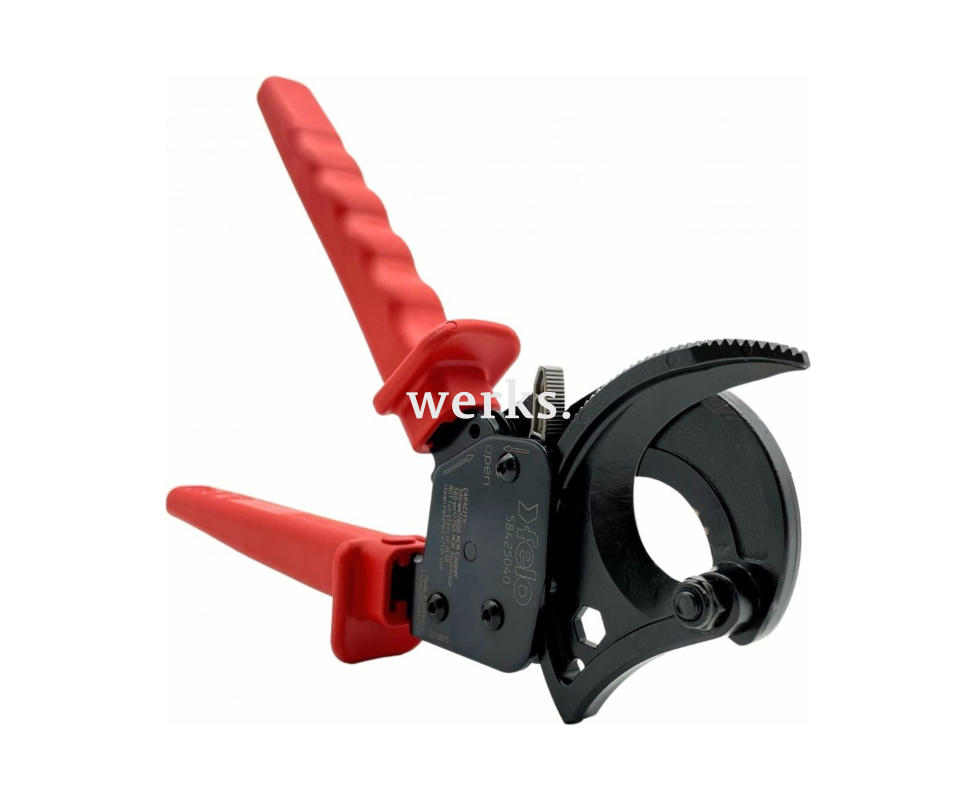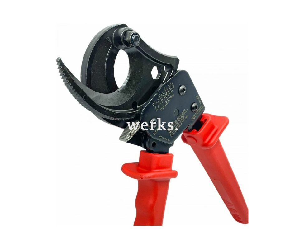 Инструмент предназначен для легкой и удобной резки кабелей. Он оборудован храповым механизмом, который позволяет минимизировать усилия при резке толстых медных и алюминиевых одножильных и многожильных проводов. В конструкции предусмотрен блокиратор рукояток, предотвращающий случайное смыкание режущих кромок. Разблокировка лезвий возможна из любого положения. Инструмент оснащен трещоточным механизмом, что снижает усилия при резке толстых кабелей. Также имеются упоры для пальцев. Рукоятки выполнены из пластика, что предотвращает скольжение руки пользователя во время работы. Благодаря компактным размерам и небольшому весу, инструмент удобно использовать в ограниченных пространствах. Изделие изготовлено из специальной легированной стали, что повышает его прочность и долговечность. Поверхность покрыта черным лаком, защищающим от коррозии. Не рекомендуется применять для резки стальной проволоки и тросов. Диапазон сечений кабелей для резки: алюминиевый кабель – до 380 мм², медный кабель – до 300 мм².