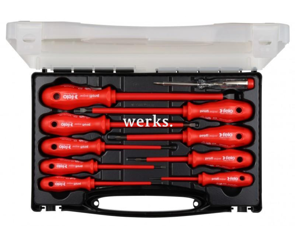 Комплект включает 7 шлицевых отверток Felo Super Profi серии 600, отвертку-пробник и 2 крестовые отвертки Phillips из той же серии 600. Эти инструменты соответствуют стандартам VDE и безопасны для использования с электрическим оборудованием при напряжении до 1000 В переменного тока. Упакованы в удобный пластиковый кейс.