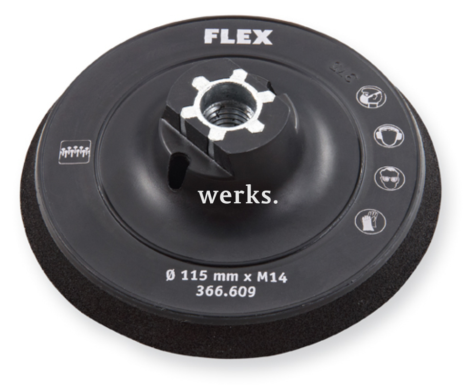 Опорный тарельчатый шлифовальный круг с креплением на 'липучке' диаметром 115 мм Flex 366609. Оснащен 12-миллиметровым слоем пористой резины, который обеспечивает равномерное распределение давления во время шлифовки, что способствует достижению оптимального результата.