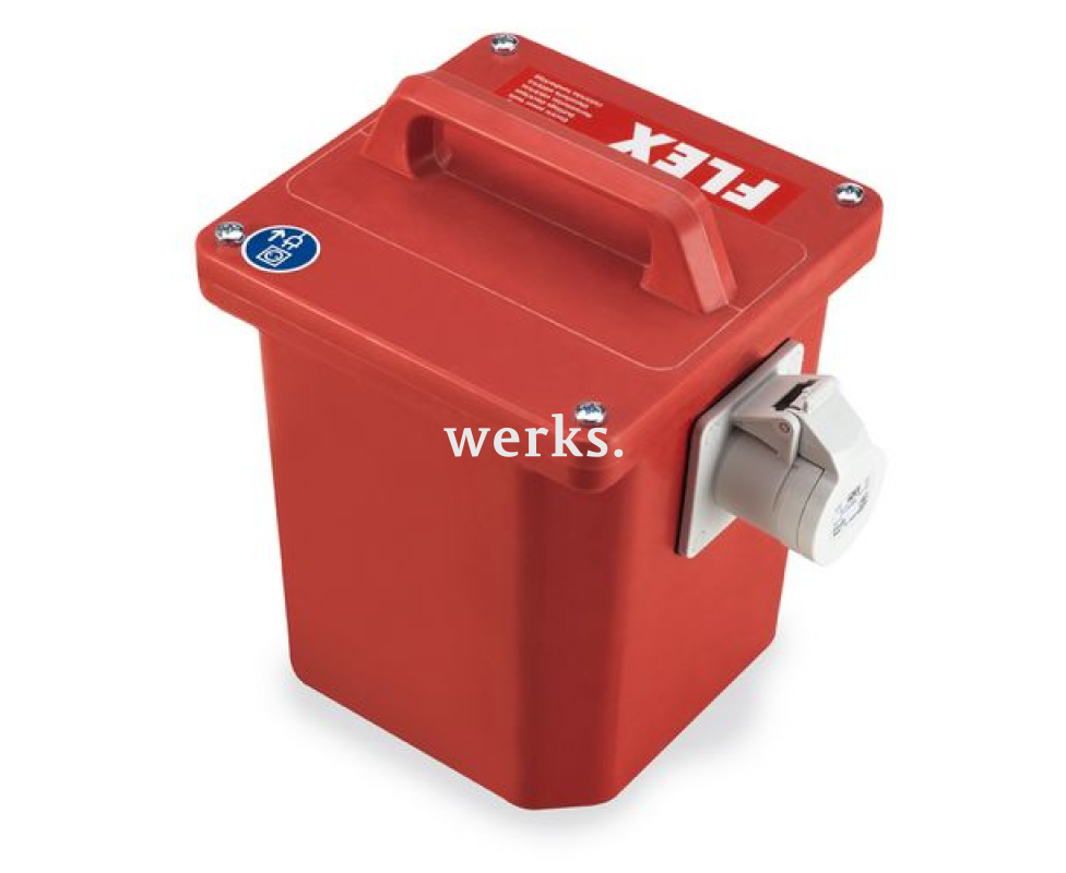 Разделительный трансформатор Flex TT 2000 373370 предназначен для электроинструментов. Он имеет разъем для фигурного штекера Flex. Контакт заземления расположен в верхней части, в положении 12 часов. Максимальная мощность позволяет работать до 45 минут без перерыва, достигая 2000 ВА.