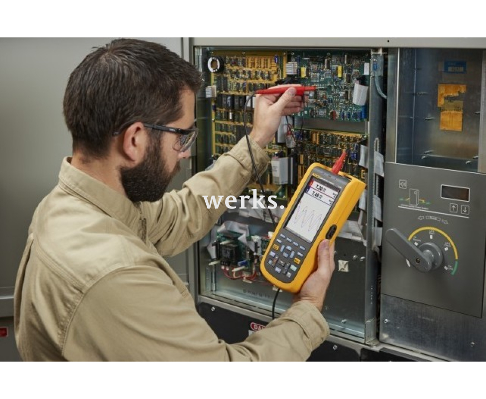 Портативный инструмент для диагностики и технического обслуживания электрических и электромеханических систем. Этот многофункциональный прибор сочетает в себе осциллограф, мультиметр и высокоскоростной регистратор. Он способен измерять напряжение, сопротивление, силу тока, емкость и проверять целостность электрических цепей. При работе с однофазными или трехфазными системами с равномерной нагрузкой осциллограф с двумя входами позволяет измерять среднеквадратичные значения напряжения постоянного и переменного тока по каналу A, а также среднеквадратичные значения силы тока по каналу B. Режим Connect and View обеспечивает мгновенное включение стабильного отображения. Быстрое получение ключевых характеристик электроснабжения для проверки мощности системы. Программное обеспечение включает мобильное приложение для беспроводной передачи данных Fluke Connect и FlukeView для анализа и архивирования важной диагностической информации. Прибор отображает форму сигнала с помощью технологии автоматической синхронизации Connect-and-View и автоматически показывает численные измерения с помощью Fluke IntellaSet. Автоматическая настройка измерений. Функция обнаружения событий регистратора позволяет сохранять и фиксировать трудноуловимые перемежающиеся сигналы на повторяющихся формах сигналов до 4 кГц для последующего анализа. Два цифровых мультиметра (5000 единиц измерения) измеряют истинные среднеквадратичные значения. Регистратор формы волны и показаний с двумя входами для мониторинга тенденций на протяжении длительного времени. Функция установки нуля позволяет установить текущее значение в качестве эталона. Прибор безопасен в эксплуатации, его корпус выполнен из прочного противоударного пластика и защищен от пыли и влаги. Хранение настроек приборов, заданных тестовой последовательностью, для планового обслуживания или часто используемых проверок. Дополнительный WiFi-адаптер, подключаемый к внутреннему USB-порту, обеспечивает беспроводную передачу данных на ПК. Большой цветной ЖК-дисплей с разрешением 640 x 480 пикселей и подсветкой. Рабочая температура составляет от 0°С до 40°С. Диапазон измерений: