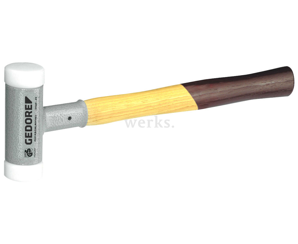 Молоток без отдачи 248 H-70 370 мм от Gedore (артикул 8728300) весит 2330 г и имеет диаметр головки 70 мм. Этот специализированный инструмент отличается прочной рукояткой, выполненной из дерева гикори. Металлические элементы обработаны порошковой ударопрочной эмалью.