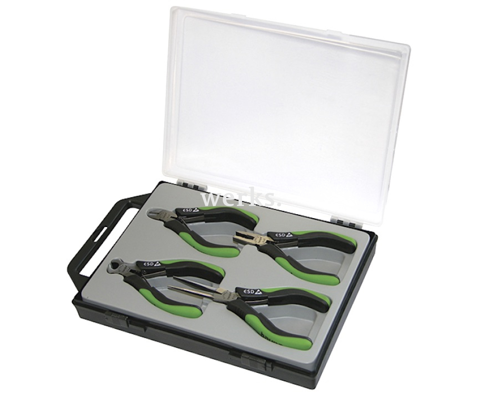 Комплект высокоточных антистатических инструментов, предназначенных для работы с электроникой и деликатной механикой, подверженной воздействию статического электричества. В комплект входят прямые игольчатые длинногубцы, бокорезы, торцевые кусачки и пассатижи. Инструменты упакованы в пластиковый кейс с поролоновой вставкой, что обеспечивает удобство хранения и транспортировки. 211880