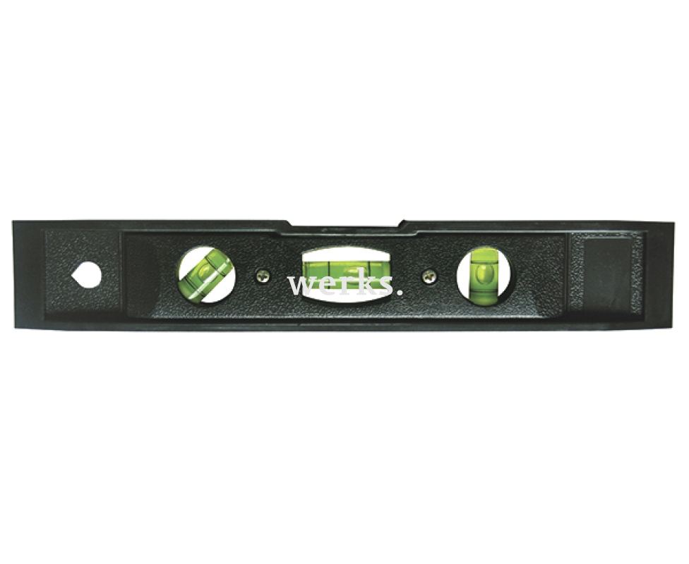 Длина уровня составляет 250 мм, предназначен для распределительного шкафа. Имеет торпедообразный дизайн, выполнен из прочного, токонепроводящего вспененного пластика. Оснащен пузырьковыми камерами, расположенными горизонтально, вертикально и под углом 45°. 240059