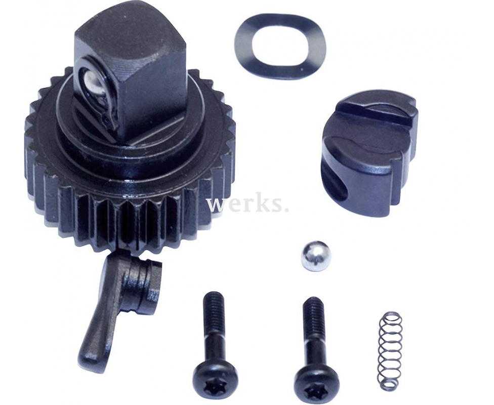 Включает в себя храповое колесо с трещоткой, запорный механизм, рычаг переключения, винты, шарик, пружину сжатия, эластичную шайбу и стопорное кольцо. Совместим с динамометрическими ключами Hazet 6403-1 и 6404-1.