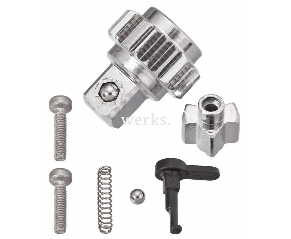 Комплект для ремонта храпового механизма реверсивной трещотки включает в себя переключающий рычаг, шарик, пружину зажима, пару винтов и храповое колесо с собачкой, имеющее 20 зубцов и угол возврата 18°. Этот комплект совместим с трещоткой Hazet 863X. 863X/7