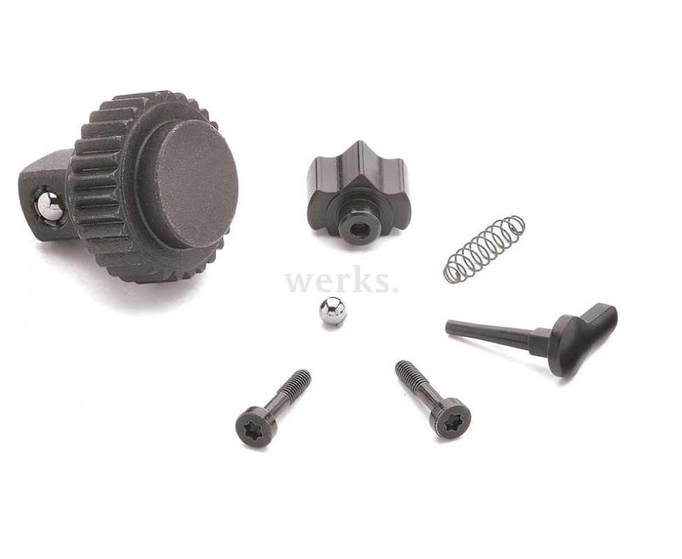 Комплект для ремонта храпового механизма реверсивной трещотки включает в себя переключающий рычаг, шарик, пружину зажима, пару винтов и храповое колесо с собачкой, имеющее 30 зубцов и угол возврата 12°. Этот комплект совместим с трещотками моделей Hazet 8816G, 8820GK, 8816P и 8816ST.