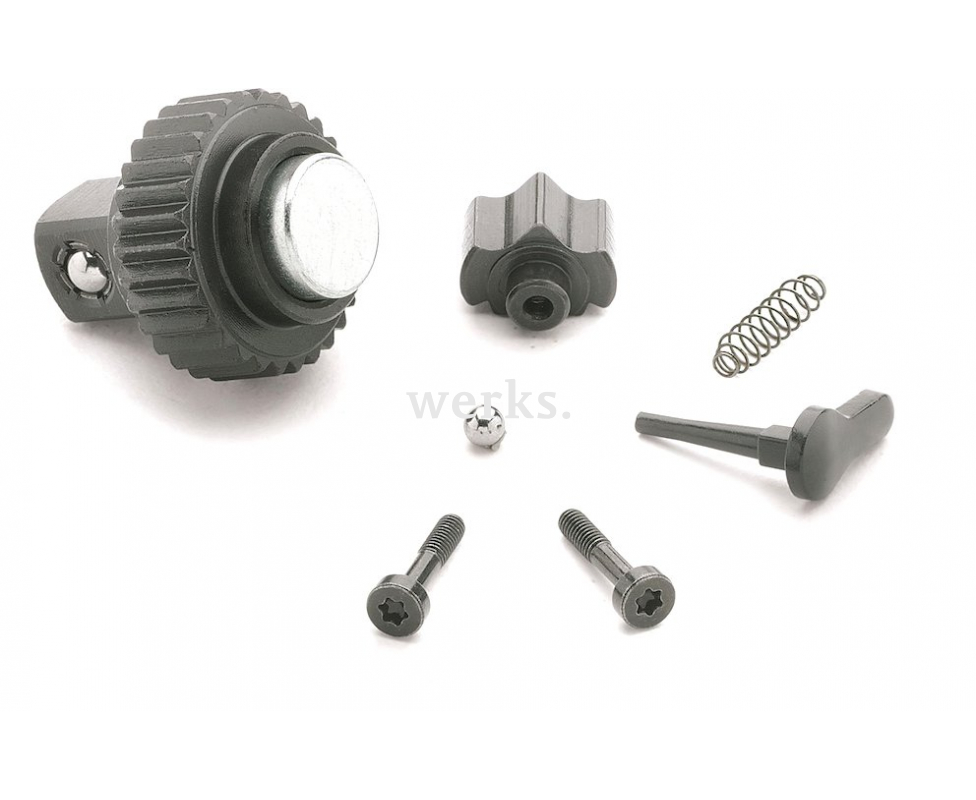 Комплект для ремонта храпового механизма реверсивной трещотки включает в себя переключающий рычаг, шарик, пружину зажима, пару винтов и храповое колесо с собачкой, имеющее 30 зубцов и угол возврата 12°. Этот комплект совместим с трещотками Hazet 8816S, 8816P, 8816G, 8816GK, 8816ST. 8816S/7
