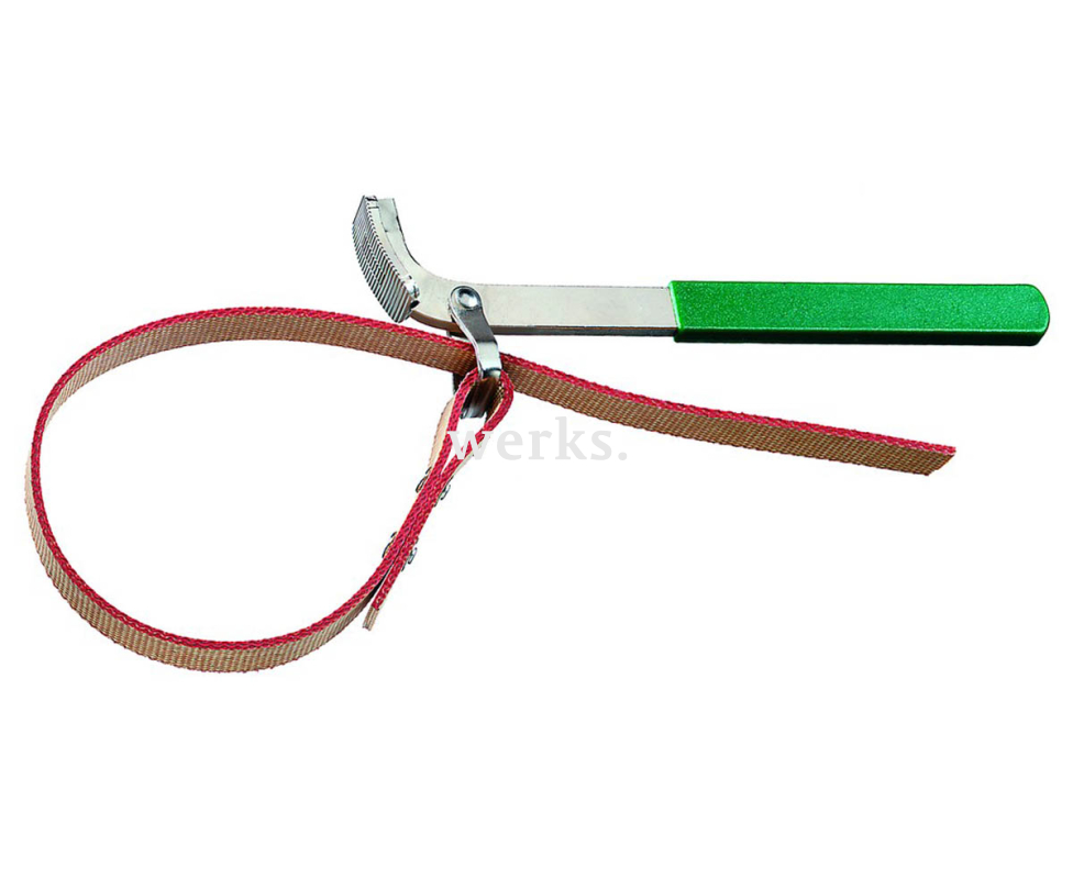 Никелированный ленточный ключ длиной 675 мм обеспечивает надежный захват компонентов. Ручка с противоскользящим ПВХ покрытием. Лента изготовлена из резинотканевого материала. Отлично подходит для демонтажа масляного фильтра и других резьбовых элементов.