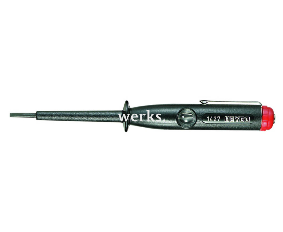 Отвертка-пробник для проверки напряжения в электрической сети с металлическим пружинным контактом. Габариты составляют 0,6 x 3,0 x 65 мм. Жало, покрытое никелем и диэлектрическим материалом. Металлический пружинный зажим позволяет удобно прикрепить инструмент к карману рубашки. Корпус обладает ударопрочными свойствами и соответствует стандартам VDE.