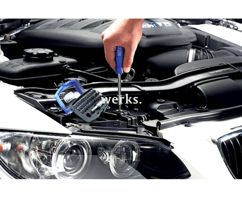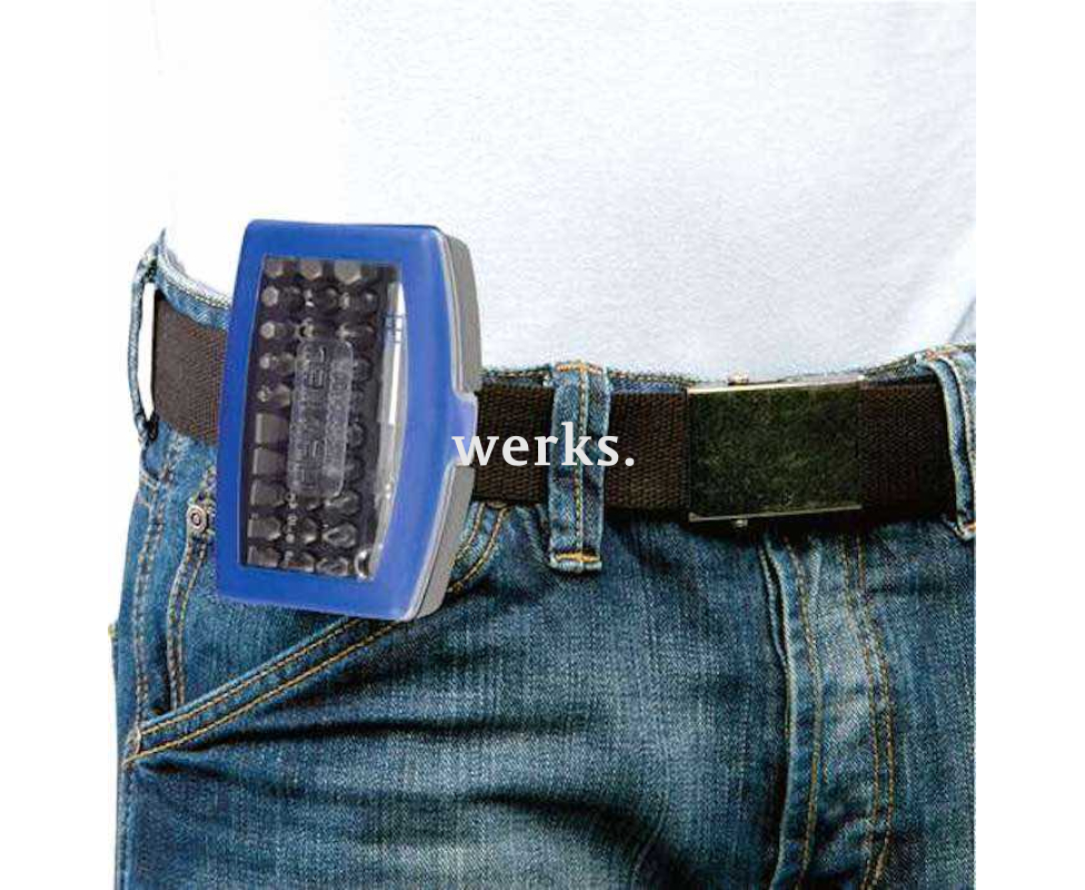 В комплект входят 30 бит (SL, PH, PZ, HEX, TORX BO, Robertson), изготовленных из прочной хромированной хромванадиевой стали с пескоструйной отделкой, а также адаптер для квадрата 1/4' и магнитный быстросменный держатель для дрели и шуруповерта. Все это упаковано в надежный и компактный футляр размером 105х65х40 мм, который оснащен поясным зажимом и отверстием для настенного крепления.